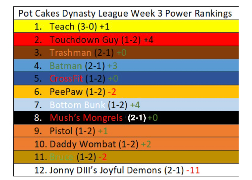 Good morning everyone, welcome to the Pot Cakes Dynasty League Week 3 Recap. What a miserable weekend of football. Not a ton of big names going off, some flyers had big weeks, some injuries, and a whole lot of headaches this weekend. A win is a win. Let’s look at possibly the worst game of the week, matchups, Dr. Tilt, and a brand new power rankings. The Power Rankings are in shambles.
