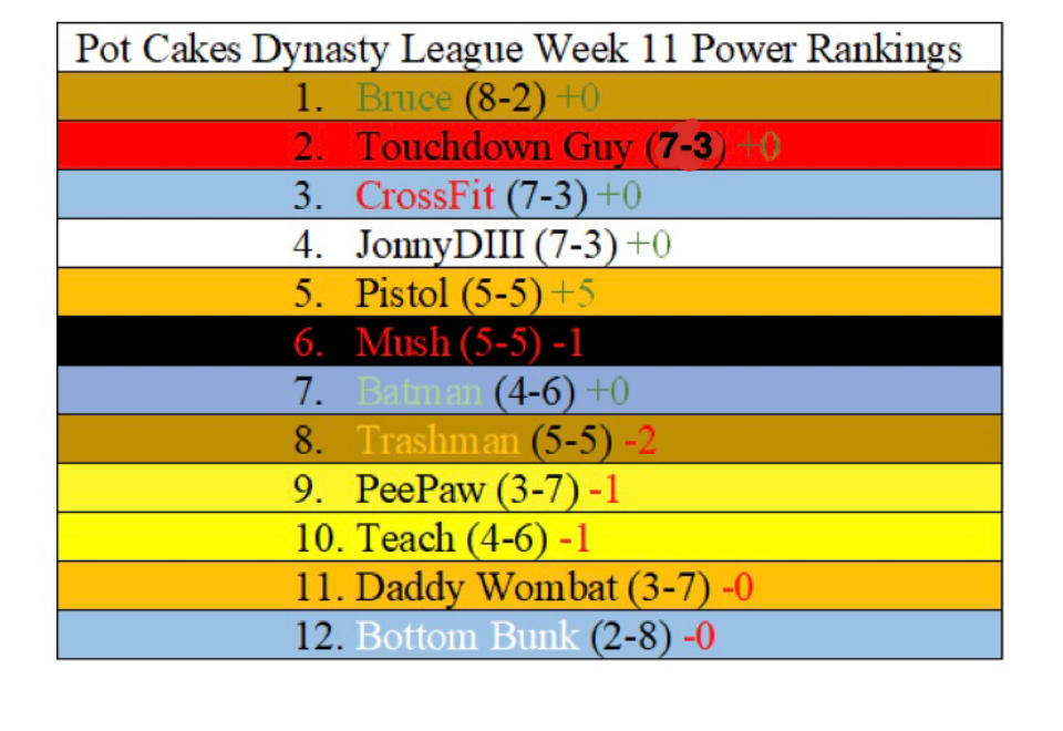 Welcome to the Pot Cakes Dynasty League Week 11 Recap. With the upcoming holiday we are doing a rare Monday night drop followed with a Tuesday preview (maybe no promises). Buckle up because this is going to be a quick one. Let’s look at the game of the week, matchups, and Dr. Tilt.