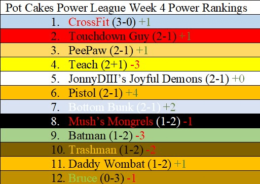 Teach took a huge hit this week. The good news is the GOTW should let Teach move up a spot. Pistol had a good week, Batman had a tough loss, so did Trashman. There should a little shake up next week based on the matchups and potential upset of the year in Batman v. CrossFit. We will find out next week.