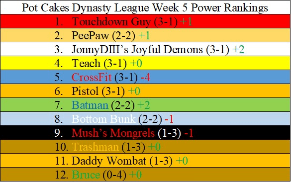 Good morning everyone, welcome to the Pot Cakes Dynasty League Week 5 Preview. Last week really threw us for a loop. We have a HOT Game of the Week, Professor Pickum is hot too and making some great picks and an all-new Power Rankings with a new #1. Let’s get to it.